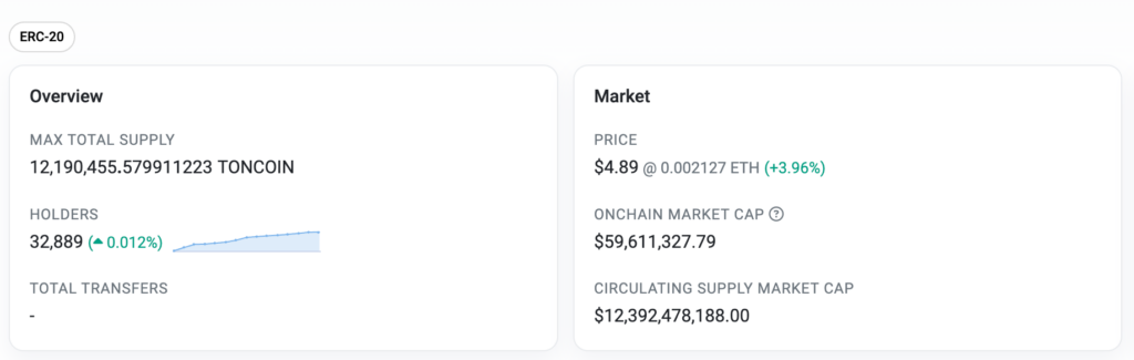Рыночная капитализация Toncoin составляет около 12 млрд долларов, что позволяет ему занимать 10-е место среди 100 крупнейших криптовалют.