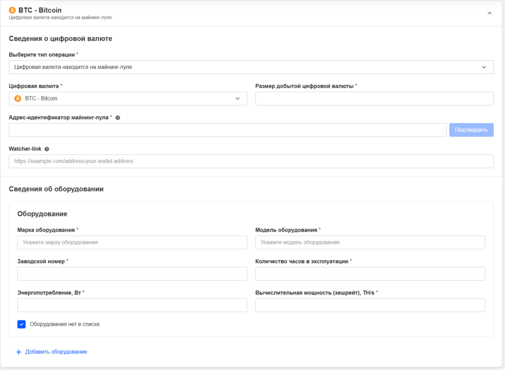 - Если у вас несколько майнеров — нажмите «Добавить оборудование» и заполните для каждого